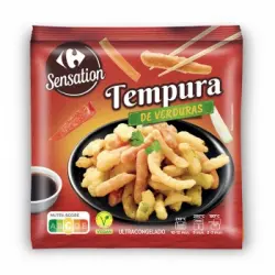 | Ingredientes: | Filetes de abadejo de Alaska MSC 65% (_pescado_ Theragra chalcogramma capturado en el Océano Pacífico Nordeste y Océano Pacífico Noroeste), harina de _trigo_, agua, aceite de girasol, sal, especias (pimentón y cúrcuma), levadura. |